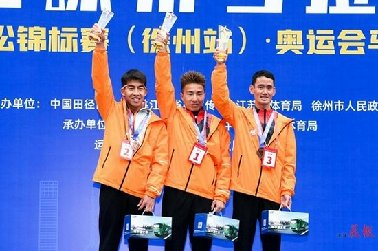 2021年4月11日,徐州马拉松男子全程冠军彭建华(中)在颁奖仪式上。省体育局供图