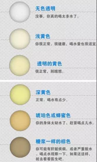 检查机体水平衡的另一种方法是尿液颜色测试。浅色尿液表示体内含水量正常,尿液颜色越深表示体内含水量越低。