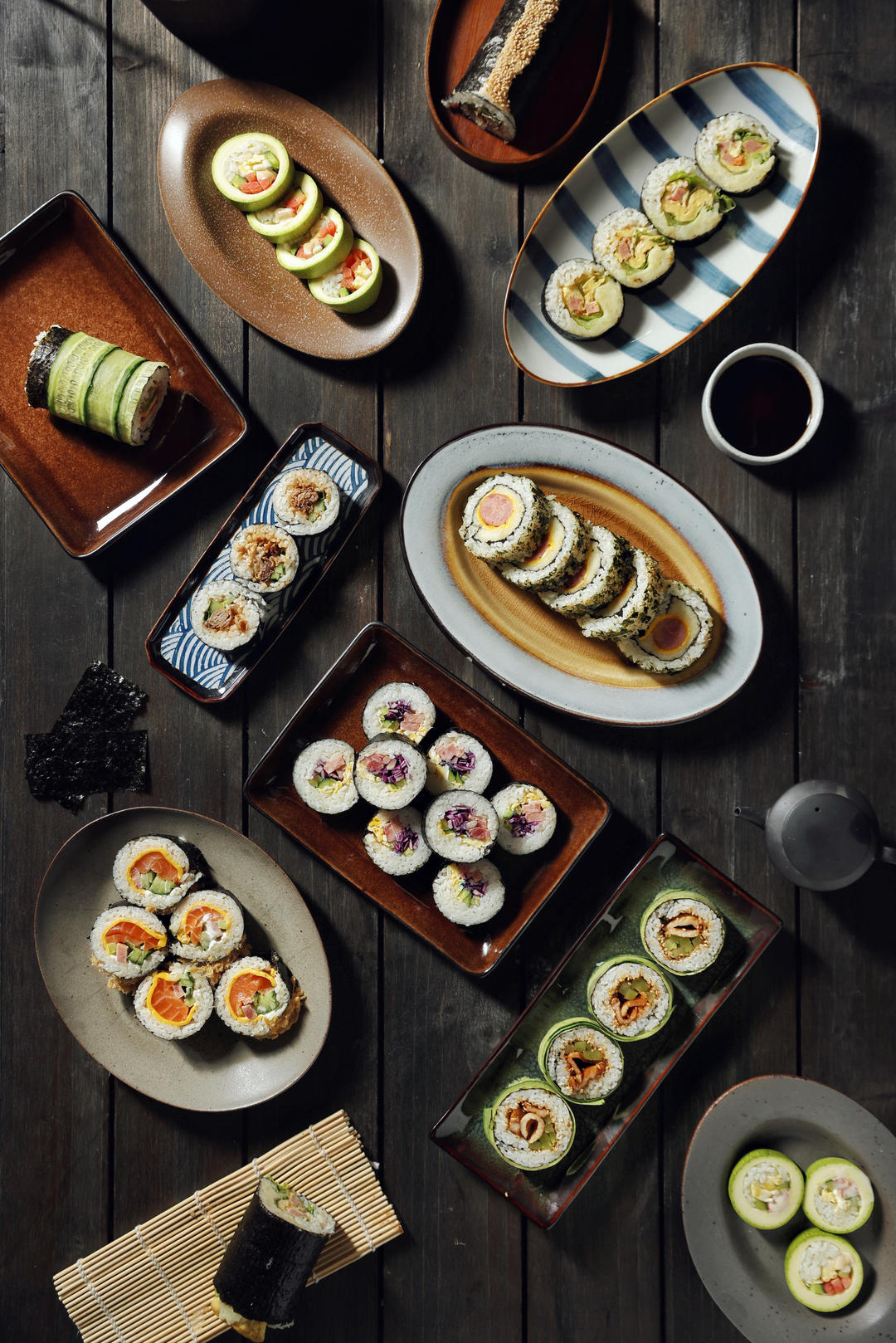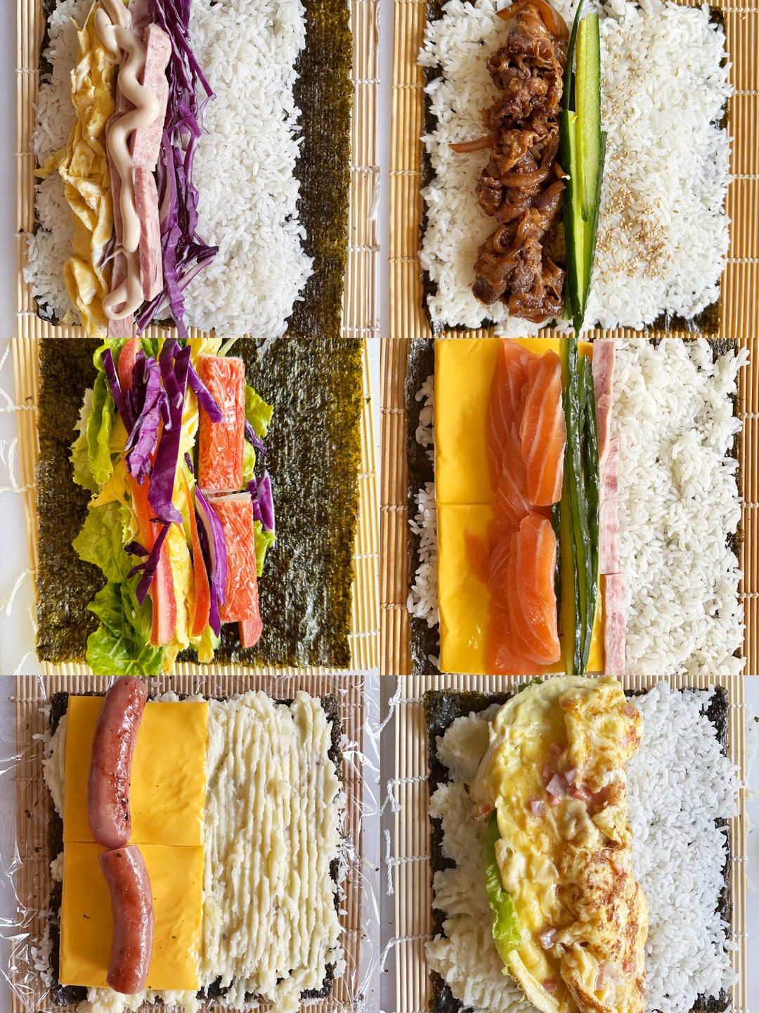 寿司合集 ❶日式照烧肥牛卷 材料:照烧肥牛120g(里面有肥牛卷、洋葱丝)、寿司海苔1片、小葱2根、黄瓜50g、白芝麻适量、照烧酱适量、寿司米饭适量。 ❷三文黄瓜牛油果卷 材料:寿司海苔一片、米饭适量、三文鱼刺身100g、牛油果50g、黄瓜50g、火腿50g、芝士片2片、沙拉酱适量、肉松适量。 ❸原谅绿莴苣黄瓜卷 材料:寿司海苔一片、米饭适量、黄瓜薄片8条、莴苣条80g、炭烧猪颈肉80g、照烧酱适量。 ❹厚蛋烧奶香土豆泥卷 材料:寿司海苔一片、米饭适量、土豆泥适量、生菜3片、火腿50g、沙拉酱适量。 ❺节瓜蔬菜寿司 材料:节瓜1根挖空中心、寿司米饭100g、胡萝卜黄瓜玉米笋适量、盐黑胡椒少许、蒜香沙拉酱适量。 ❻无米蟹棒时蔬卷 材料:寿司海苔一片、生菜6片、蟹棒3根、莴苣80g、紫甘蓝30g、黄瓜30g、蛋皮丝50g、盐黑胡椒少许、沙拉酱适量。 ❼鸡蛋火腿时蔬卷 材料:寿司海苔一片、米饭适量、鸡蛋丝80g、火腿80g、紫甘蓝40g、黄瓜40g、沙拉酱适量。 ❽芝士土豆泥香肠反卷 材料:寿司海苔2片、海苔芝麻碎适量、米饭适量、土豆泥适量、芝士片2片、台湾烤肠2根、沙拉酱芝士酱适量。
