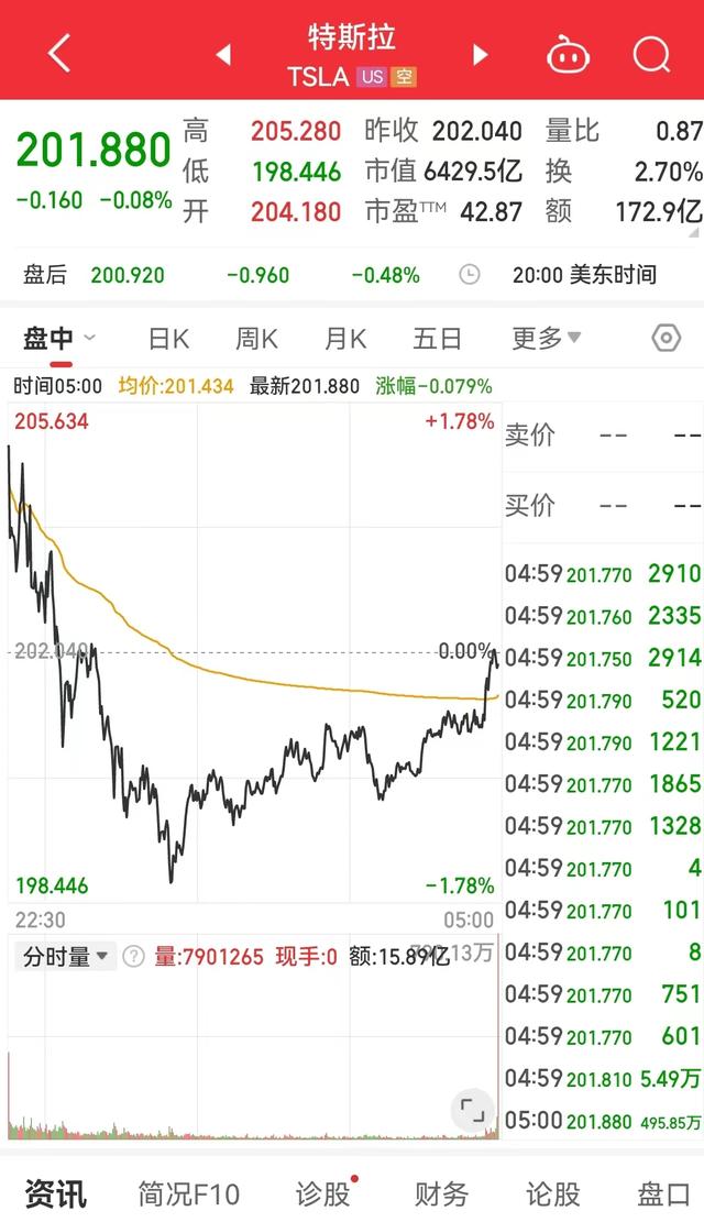 截至当地时间2月29日,特斯拉(TSLA)报201.88美元,跌幅0.08%,市值6429.5亿美元。