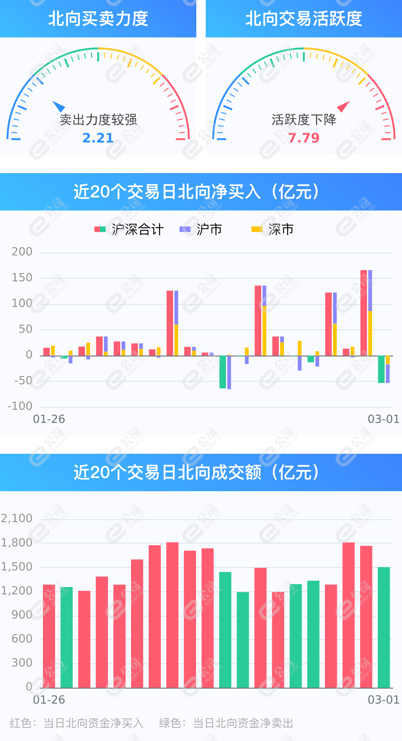 3月1日,截至A股收盘,北向资金合计净卖出53.34亿元,其中沪股通净卖出17.1亿元,深股通净卖出36.24亿元。北向资金成交金额1503.28亿元,占A股总成交额14.25%,交易活跃度下降14.97%,其中沪股通买入金额342.11亿元,卖出金额359.21亿元,深股通买入金额382.86亿元,卖出金额419.10亿元。北向资金中止连续3日净买入。