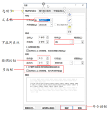 对话框的作用是为用户提供信息和操作选择。如右图的对话框包含了七种常见的组件,分别是:选项卡、文本框、下拉列表框、单选按钮、复选按钮、命令按钮和微调按钮。
